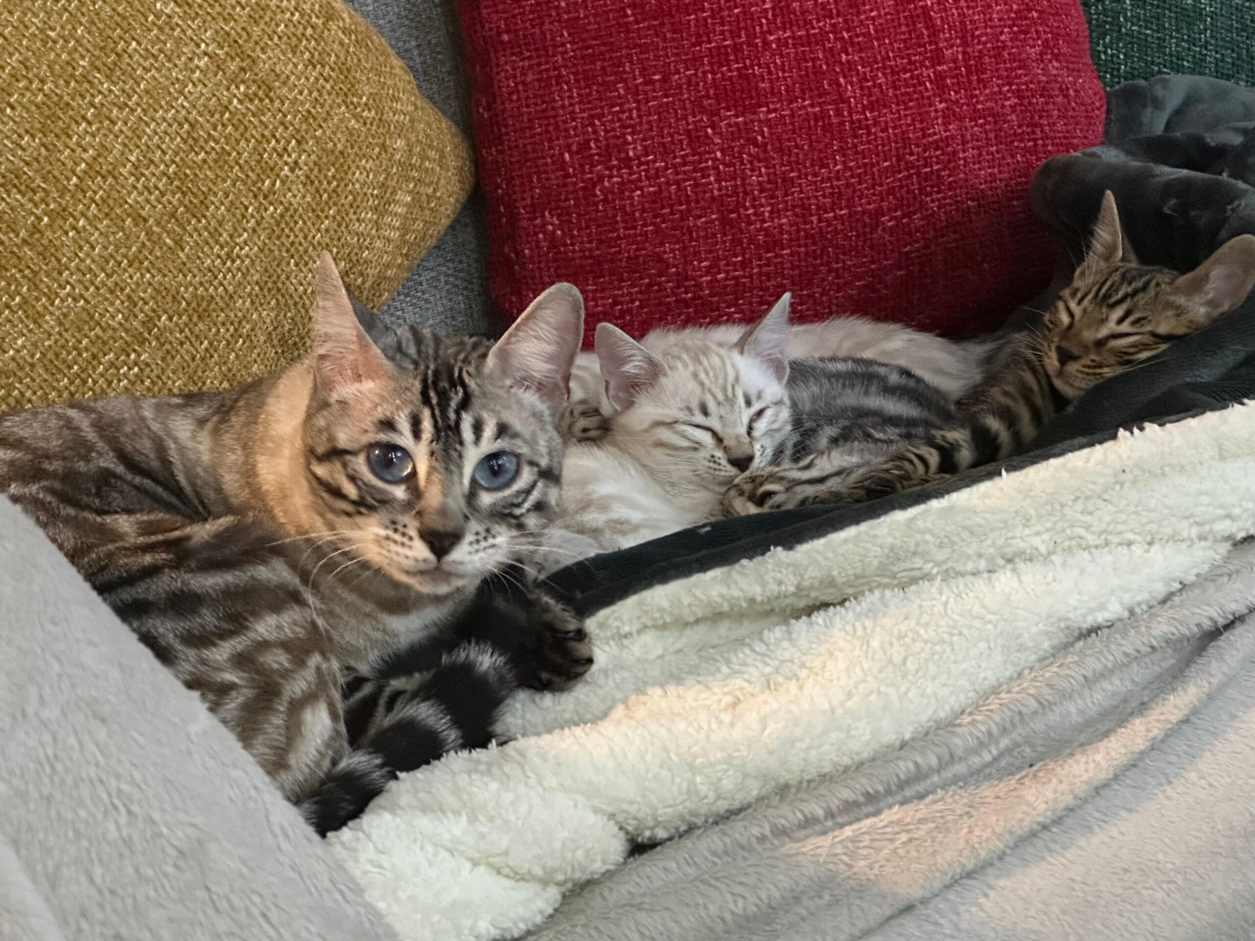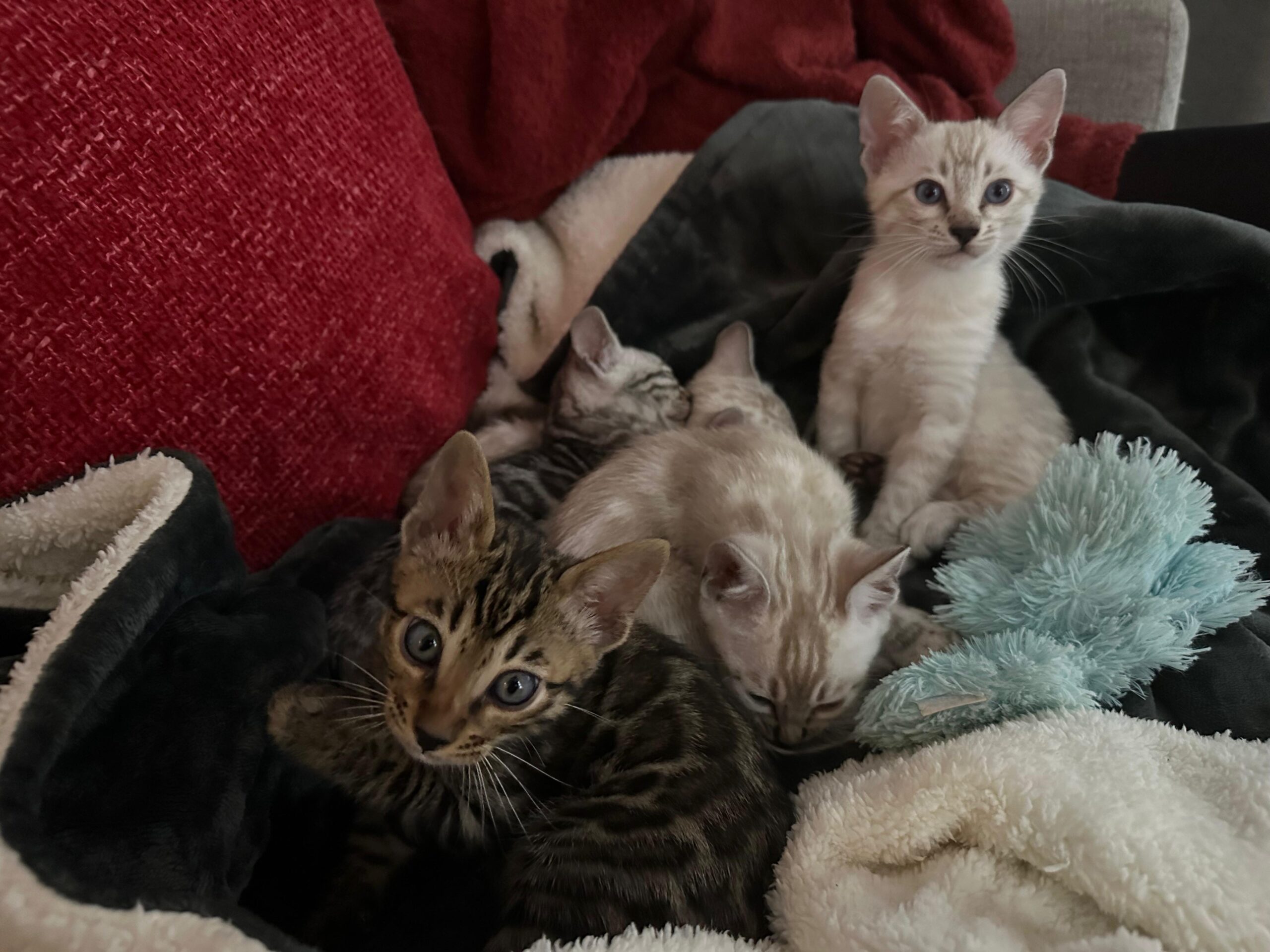 1 brown boy, 1 silver boy, 2 silver snows lynx boys and 1 silver snow lynx girl. They will be ready for their forever homes in January.